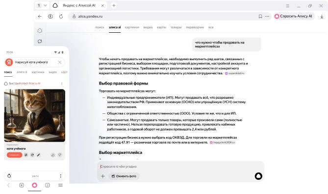 Алиса AI всегда рядом — в чате, в Поискеи на любой странице в интернете. Она отвечаетна вопросы и помогает с повседневными делами.