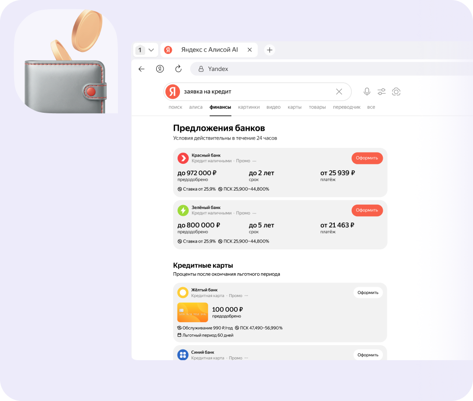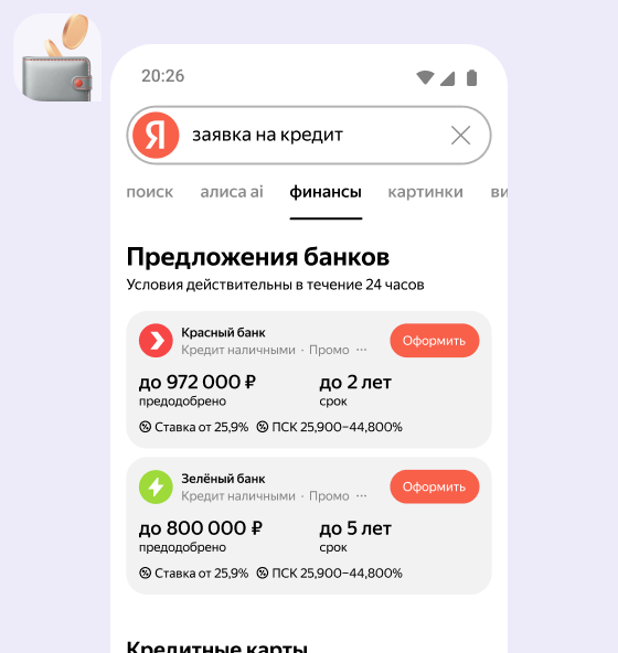 В Поиске удобно сравнивать условия банков по разным продуктам. А теперь можно найти и рассчитать кредит по вашим параметрам и быстро получить предварительное одобрение.