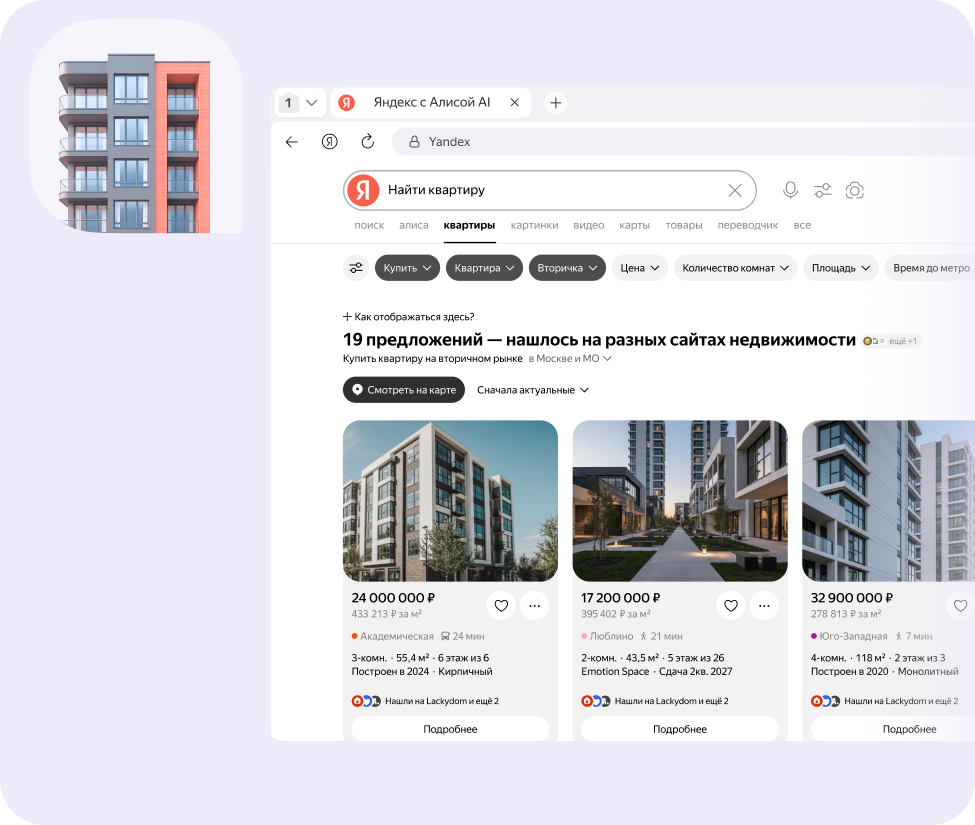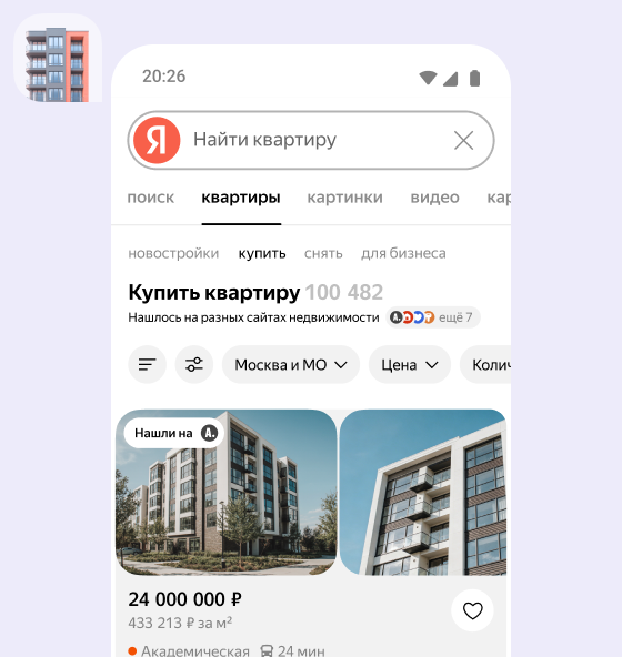 Ищите предложения с разных сайтов недвижимости. Если одна квартира есть в разных источниках (например, от собственника и от агента), то Поиск соберёт их на одной карточке, чтобы вы выбрали самое выгодное.