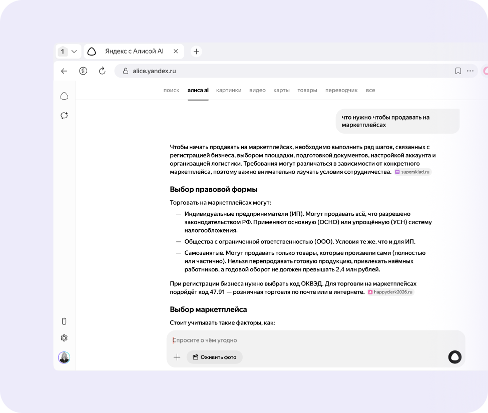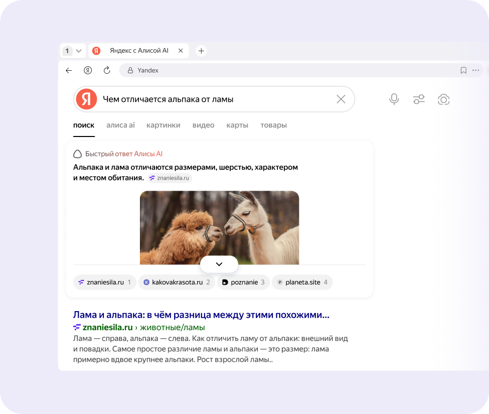 Поиск с Алисой AI предлагает структурированные ответы с разделами, картинками и видео. Быстрые ответы работают даже при ограниченном доступе к интернету.