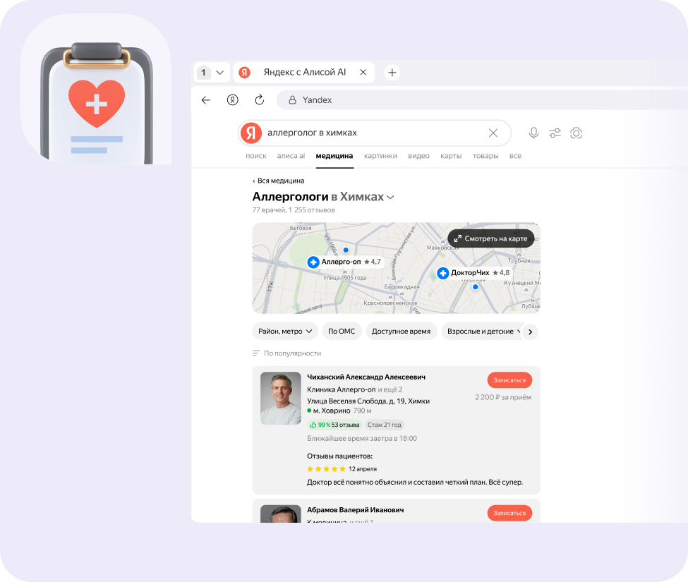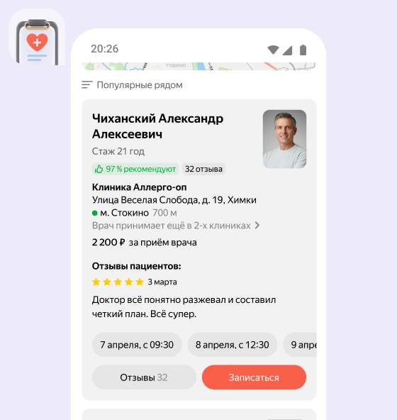 Окна в разных клиниках видны сразу в Поиске. Выбирайте удобное время и переходите к записи.