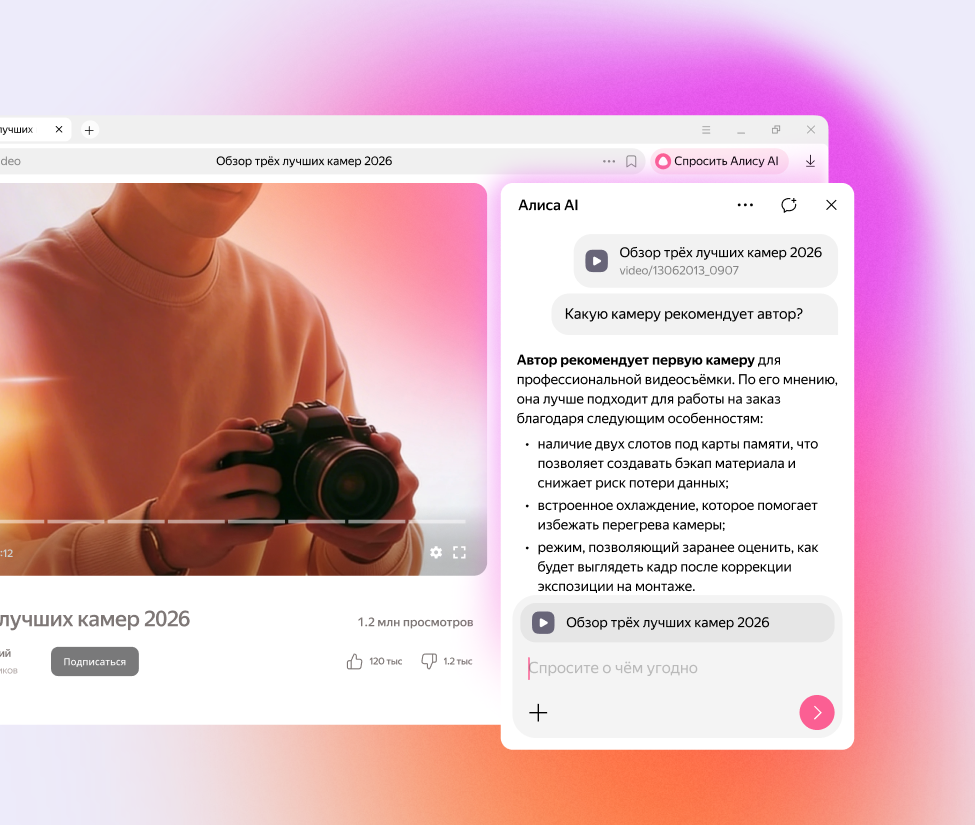Всегда в правом верхнем углу. Алиса AI учитывает содержимое страницы, видео или документа, а если информации не хватает — находит её в интернете.