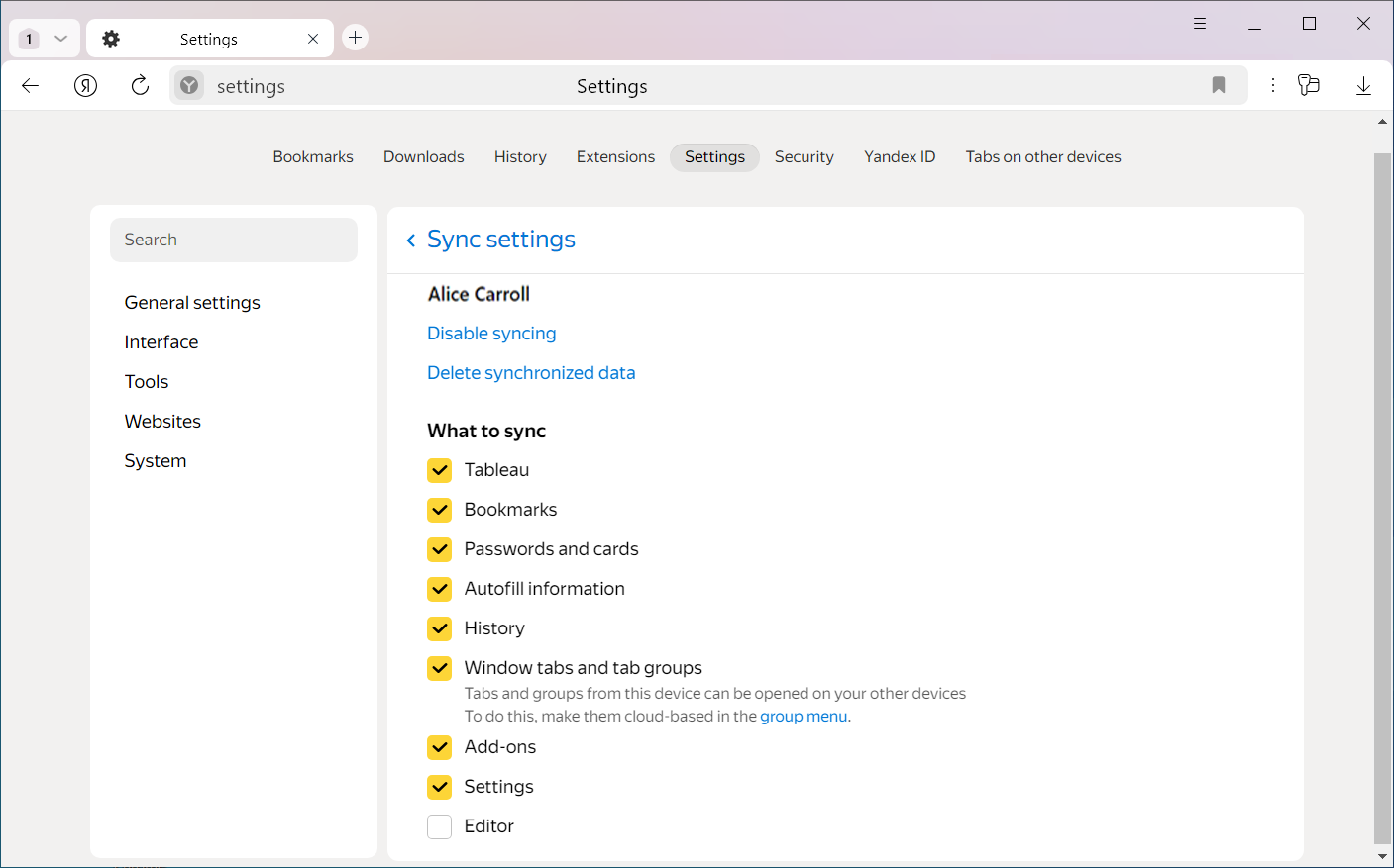 By default, Yandex Browser syncs your Tableau, bookmarks, passwords, bank cards, autofill data, history, tabs and tab groups (if you enabled cloud storage in the groups menu), extensions, and settings.
