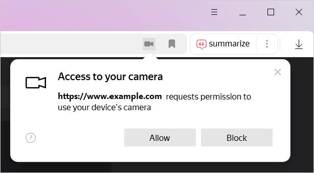 By default, when a site tries to access your camera, Yandex Browser asks for your permission.