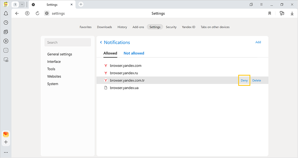 To save the settings, log in with your Yandex ID. If you are not logged in, the notification settings are saved in the Yandex Browser cookie file and deleted the next time you clear the cookies.