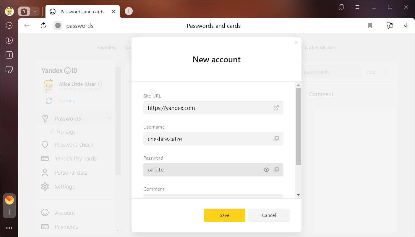 If you don't have a master password but do have a Windows or macOS password, the browser will ask you to enter it. This is safe: Yandex Browser can't access your system password since you enter it in a system window. Linux doesn't have system passwords.