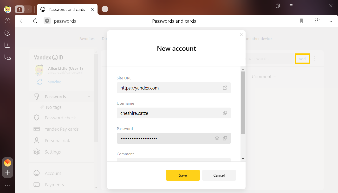 If you enter a password with no username, Yandex Browser suggests a previously saved username.