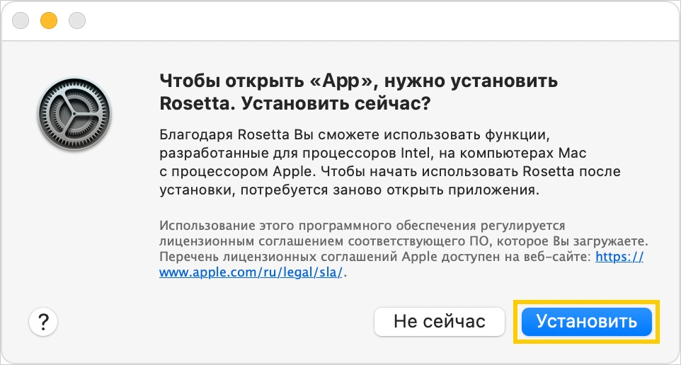 If you have a Mac device with an Apple processor, the first time you run any app, you'll get an automatic prompt to install Rosetta.