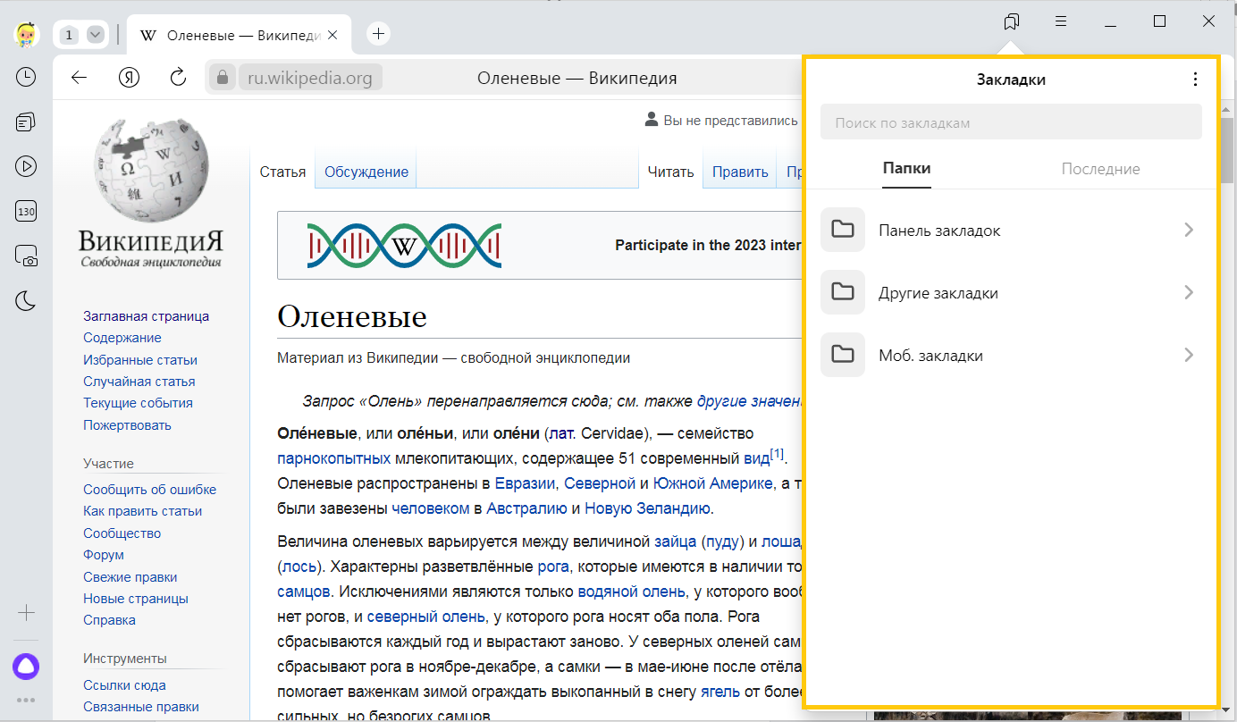 Если вы импортировали закладки из другого браузера, то перенесенные папки также появятся в левом меню. При этом названия папок останутся прежними. Подробнее см. раздел Импорт закладок.