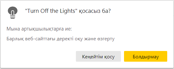Егер дереккөзге толық сенімді болсаңыз ғана, кеңейтімді қосыңыз. Бұл зиянды болуы мүмкін. Браузер зиянды кеңейтулерді бұғаттайды, бірақ егер әлі қара тізімге түспесе, деректеріңіз қатер астында болады. Толығырақ Зарарлы кеңейтімдер несімен қауіпті бөлімін қараңыз.
