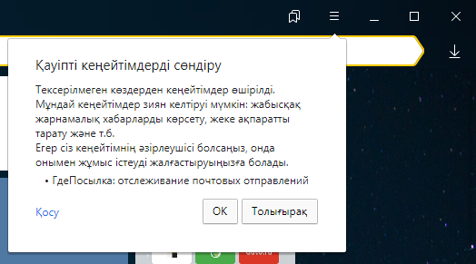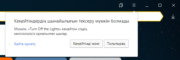 Кеңейтімді орнатпас бұрын, Браузер оны арнайы деректер базасында сақталған зиянды кеңейтімдер тізімімен салыстырады. Егер кеңейтім тізімде бар болса, Браузер оны орнатуды бұғаттайды және бұл туралы хабарлайды: