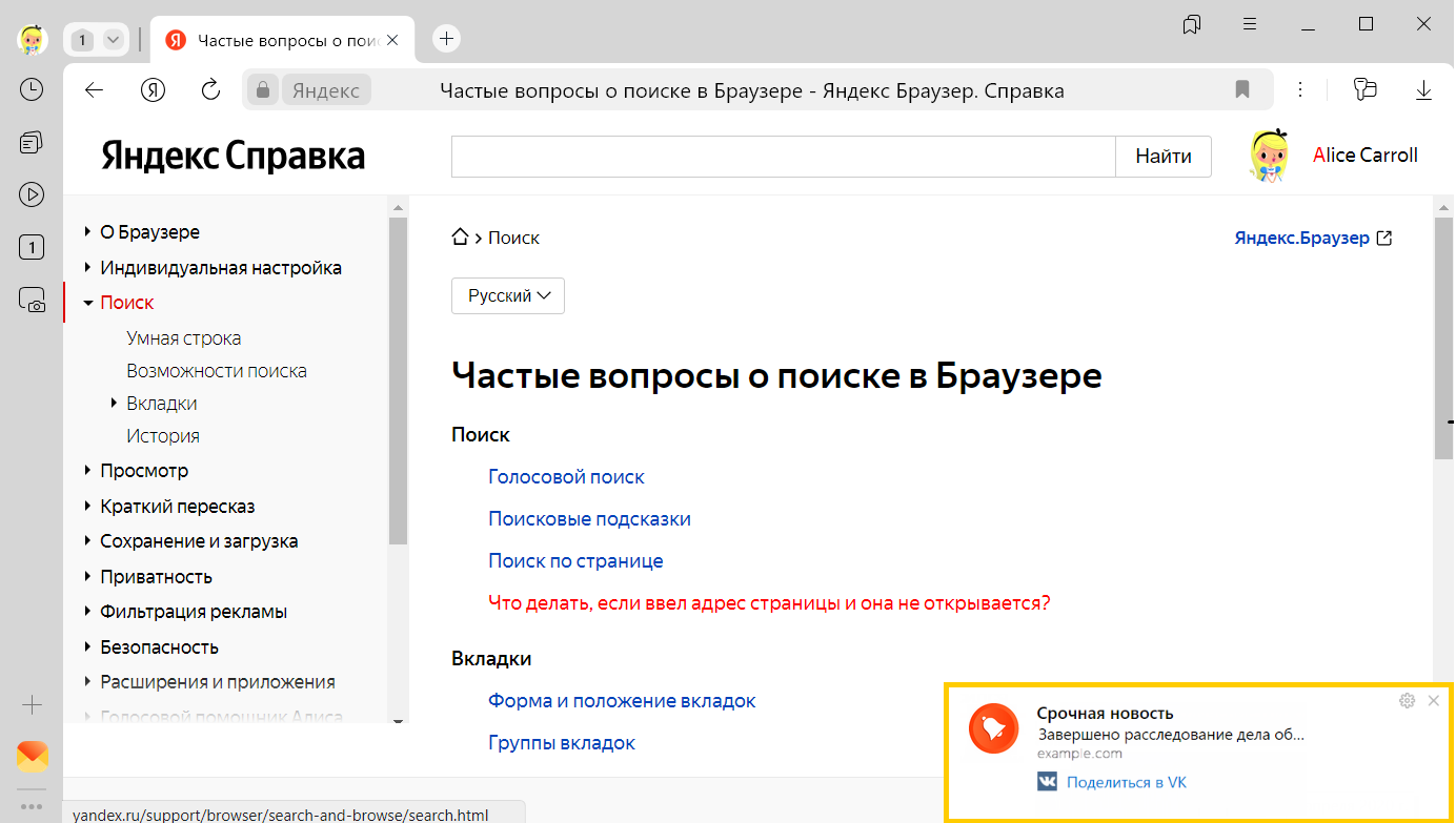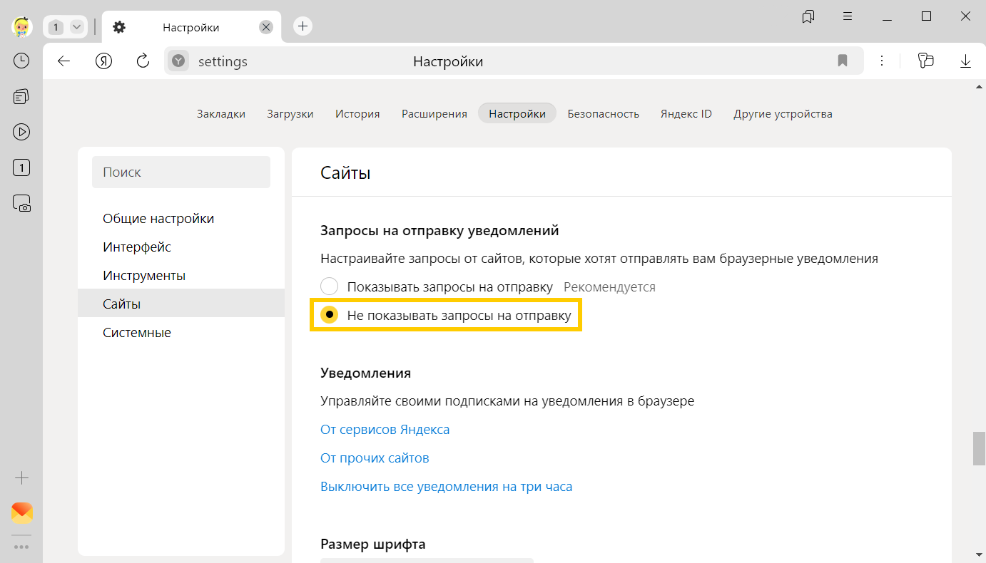 Cайты могут отправлять уведомления о новостях, комментариях, обновлениях и других событиях. Как правило, сайты запрашивают разрешение на отправку уведомлений, но иногда могут делать это без спроса. В Браузере вы можете разрешать или блокировать уведомления от конкретного сайта или вовсе запретить всем сайтам предлагать отправку уведомлений.