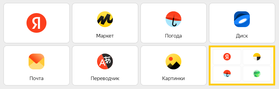 Вы можете группировать плитки в папки. Например, по умолчанию плитки со ссылками на сервисы Яндекса сгруппированы в одну папку.