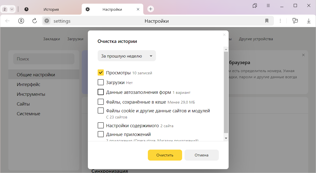 В окне Очистка истории укажите период времени, за который нужно удалить историю.