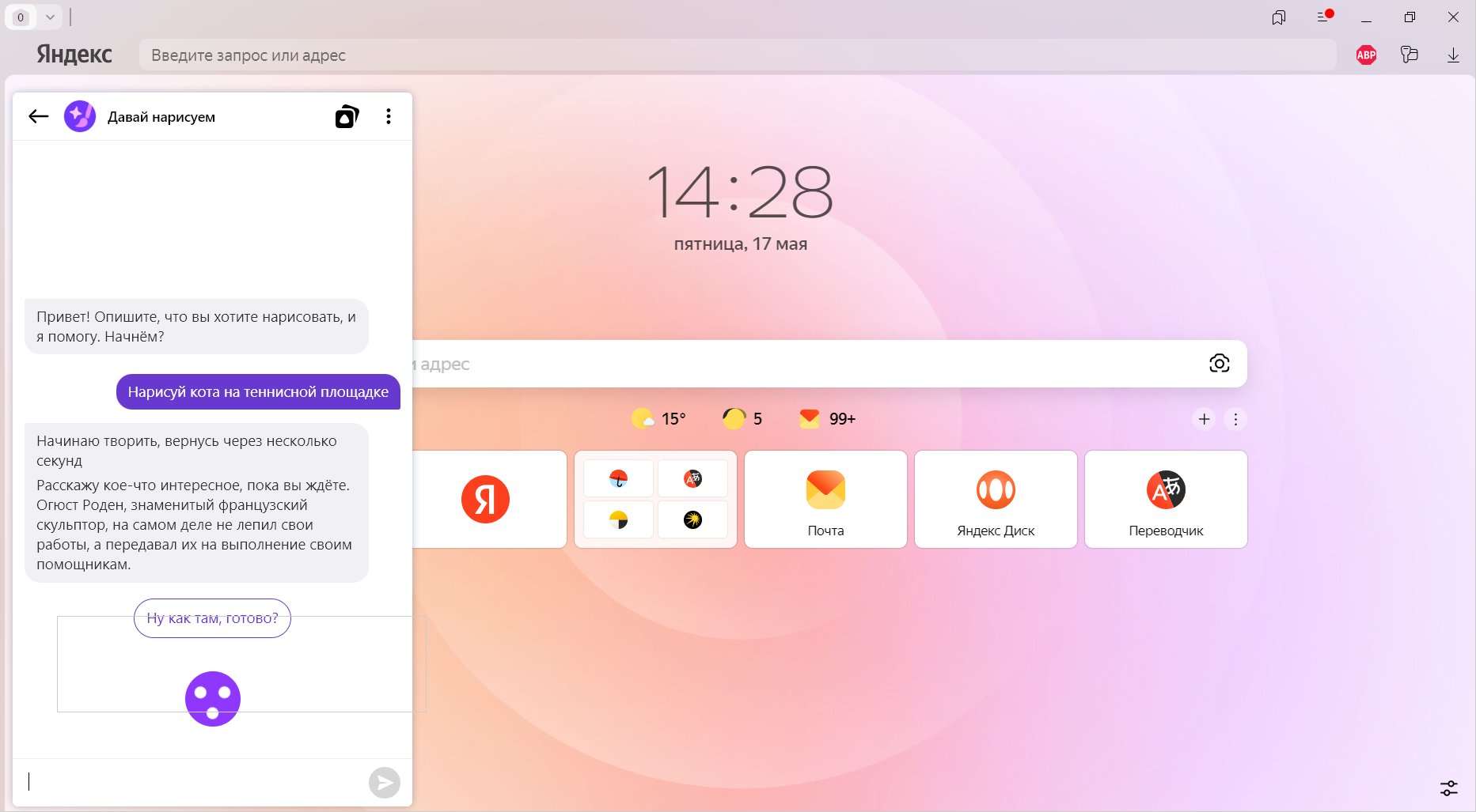 В Умной строке опишите, что хотите увидеть на изображении, например «нарисуй кота ученого».