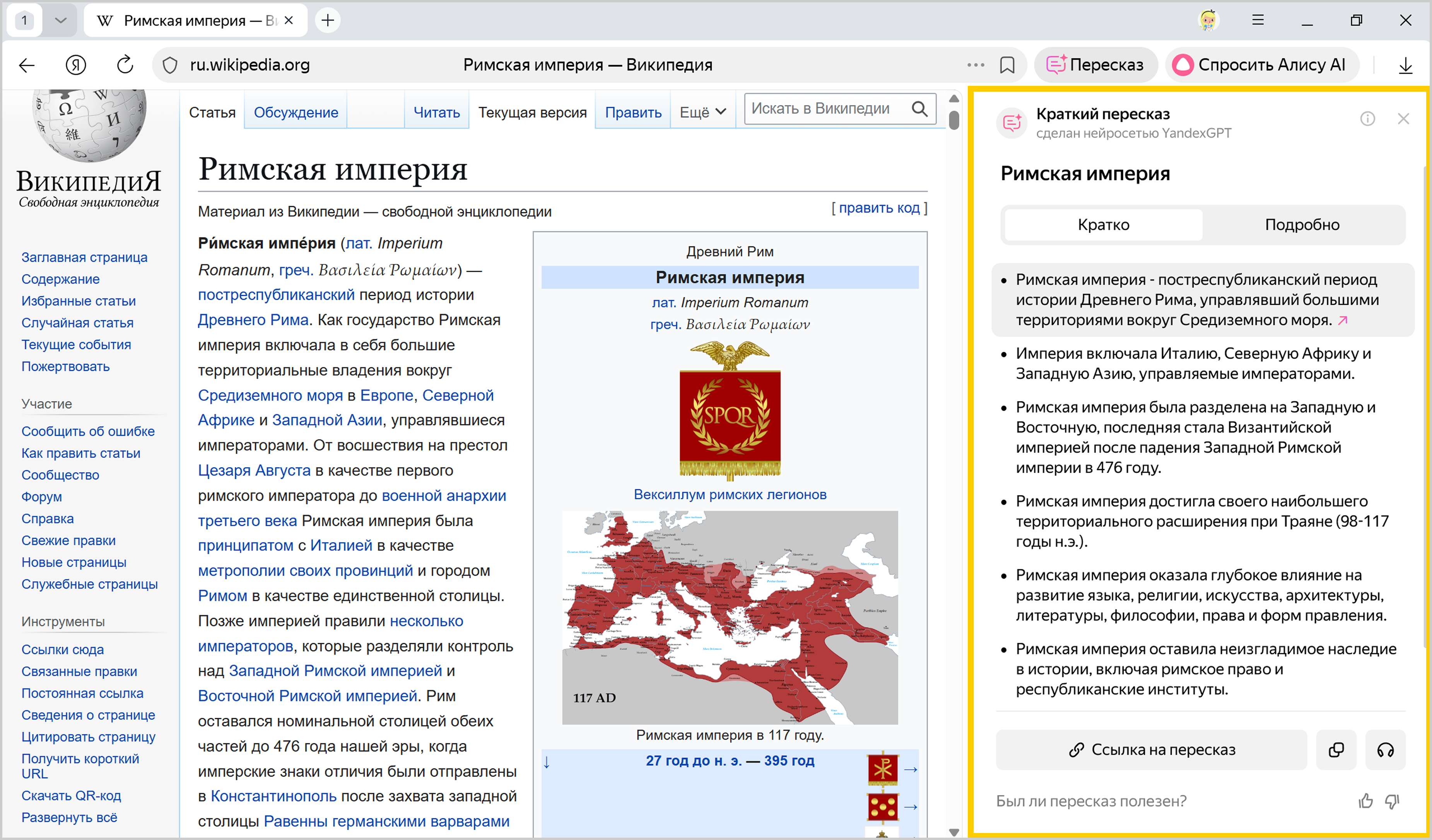 • Справа от Умной строки нажмите  Спросить Алису AIПересказать страницу.