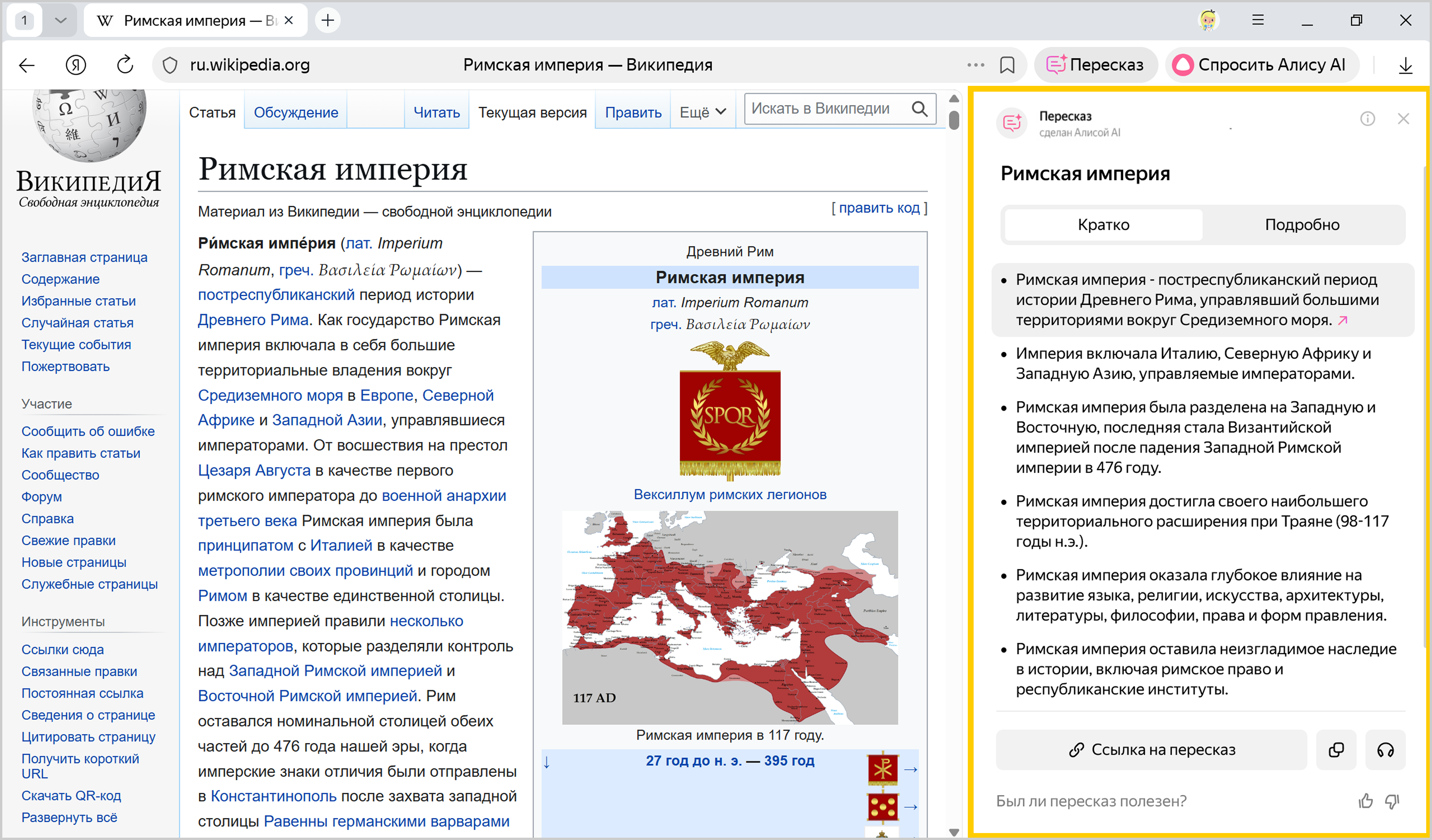 Справа от Умной строки нажмите Спросить Алису AI → Пересказать страницу.