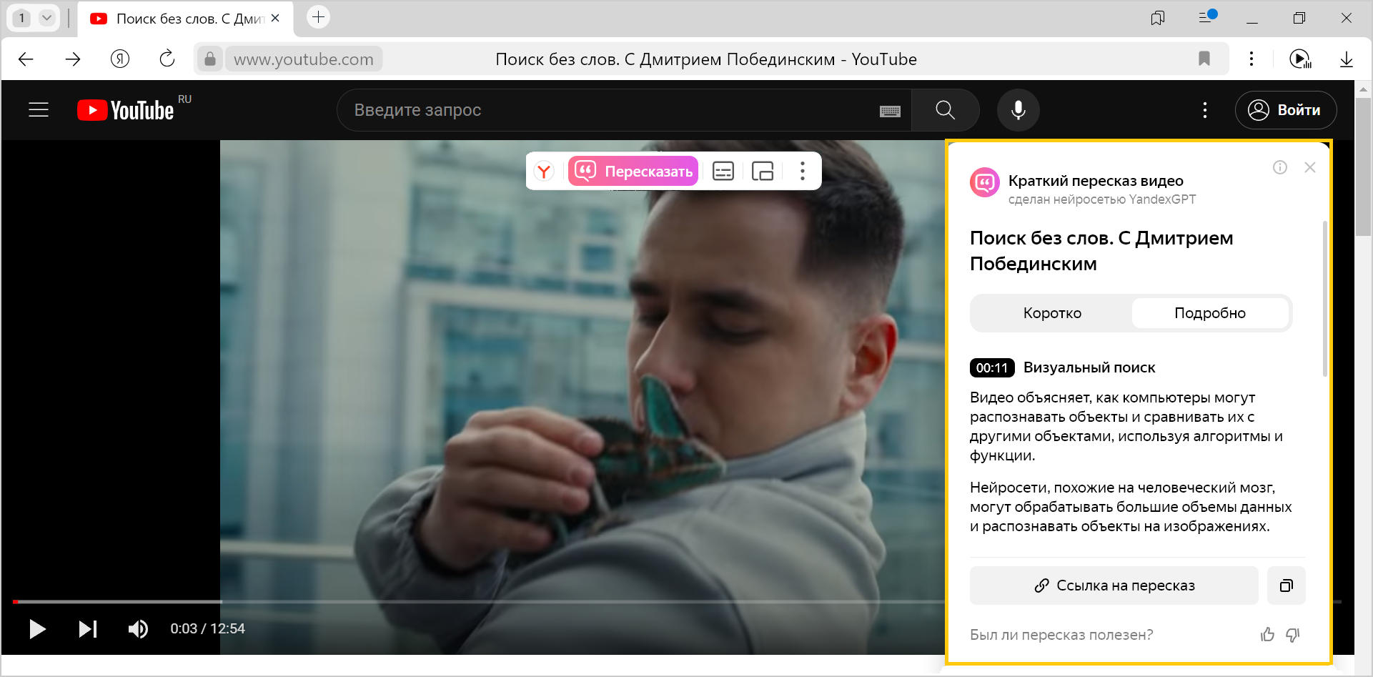 Нейросеть YandexGPT сделает краткий пересказ видео и покажет таймкоды, чтобы вы могли сразу перейти к нужному моменту. Браузер может пересказывать видео, созданные на русском, английском, французском, немецком, испанском, итальянском, китайском, японском и корейском языках. Сам пересказ будет на русском языке.
