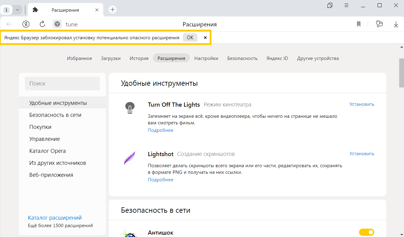 Прежде чем установить расширение, Браузер сравнивает его со списком вредоносных расширений, хранящихся в специальной базе данных. Если расширение есть в списке, Браузер блокирует его установку и сообщает об этом: