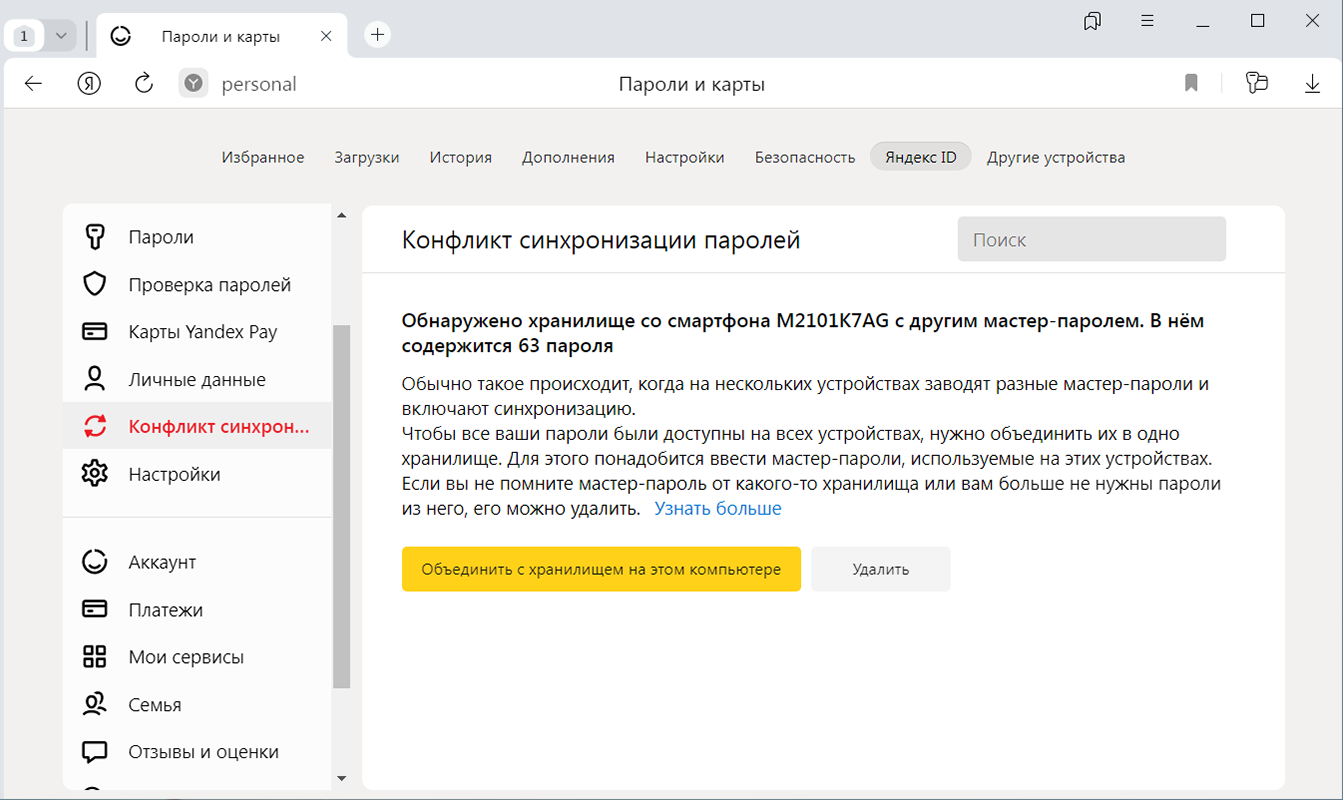 Если вы меняете мастер-пароль на одном из синхронизированных устройств, после синхронизации он поменяется и на других. Если вы меняете мастер-пароль на несинхронизированном устройстве или создаете разные мастер-пароли на устройствах до их синхронизации, возникнет конфликт. Например, вы ввели один мастер-пароль на смартфоне, другой на компьютере, а затем включили синхронизацию. В этом случае Браузер не может понять, какой из мастер-паролей нужно использовать для шифрования объединенного хранилища.