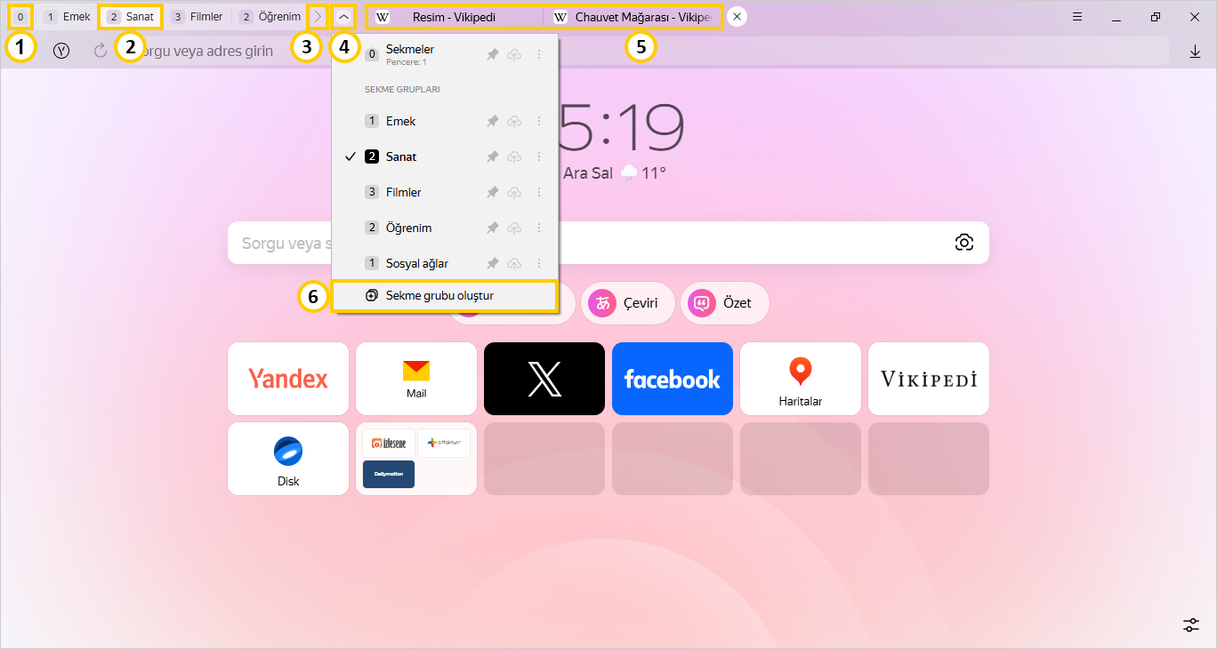 simgesine tıklayıp Sekme grubu oluştur'u seçin. Grubun adını girin. Yeni sekmeler bu grupta açılmaya başlar.