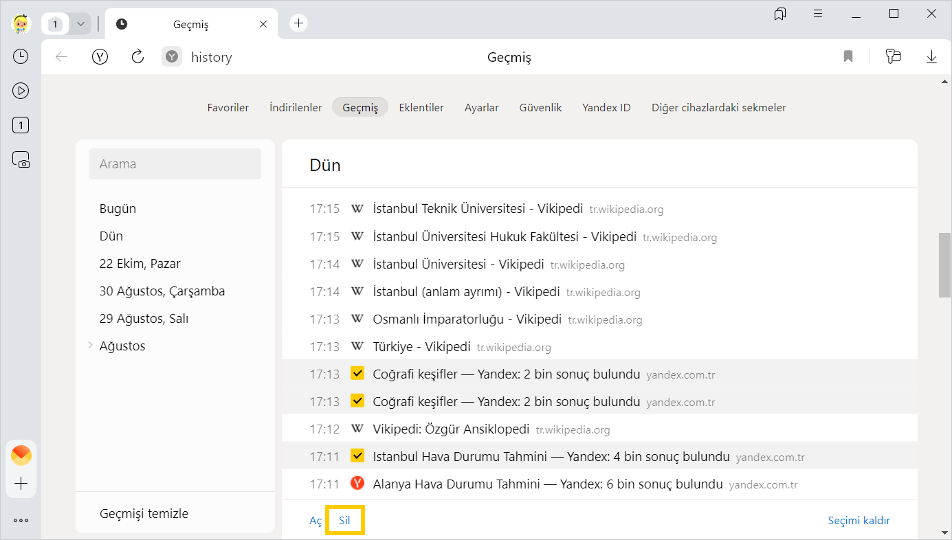 Yandex Browser'da geçmiş ziyaretlerin kaydedilmesi özelliği devre dışı bırakılamaz. Ziyaret geçmişinizi kaydedilmesini istemiyorsanız, Gizli mod'u etkinleştirin.