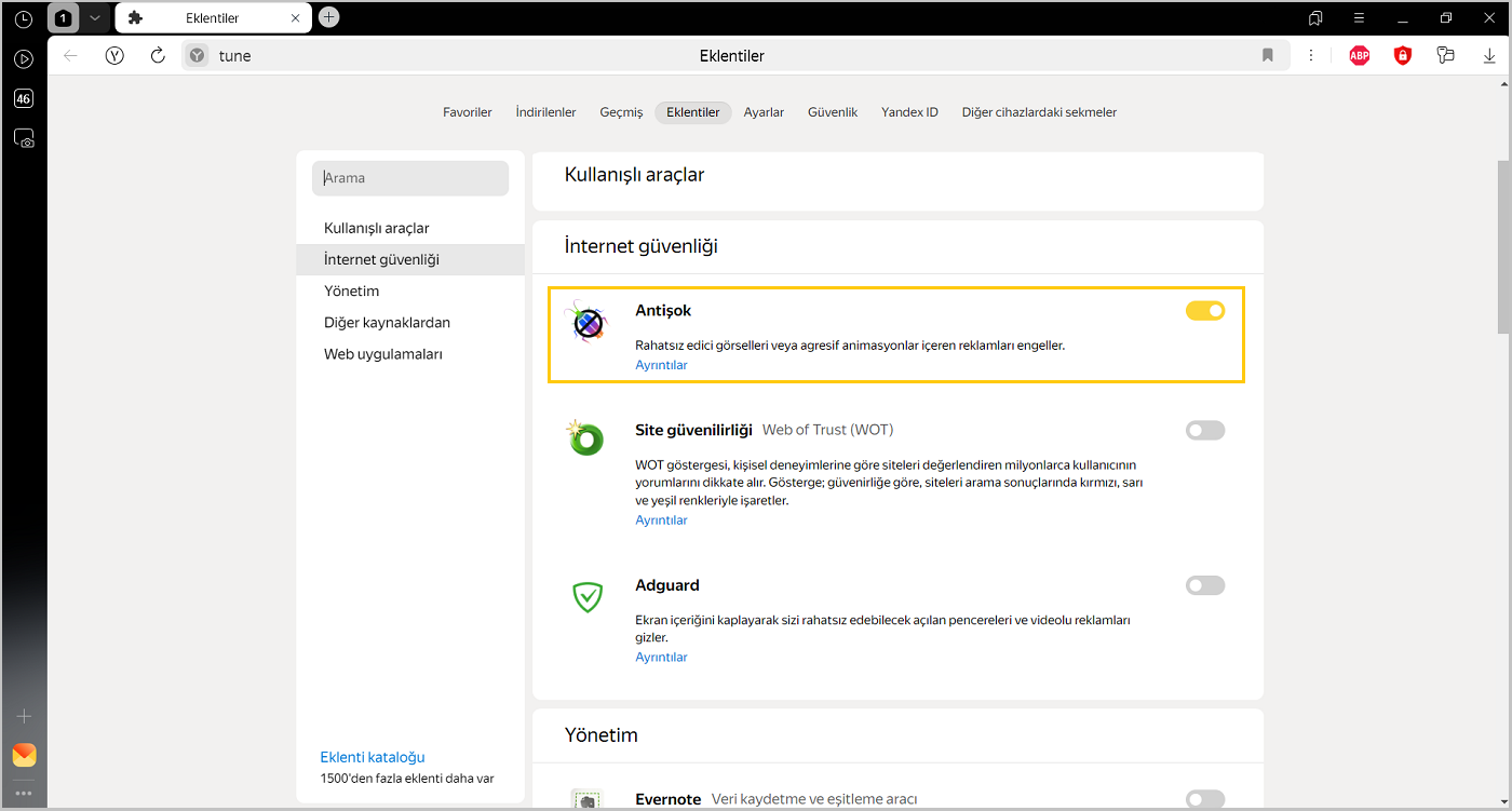 Antişok – Yandex Browser için bir eklentidir ve rahatsız edici görüntüler ya da pornografi içeren veya dolandırıcıların aldatma amacıyla hizmet sunduğu banner reklamlarını filtreler.