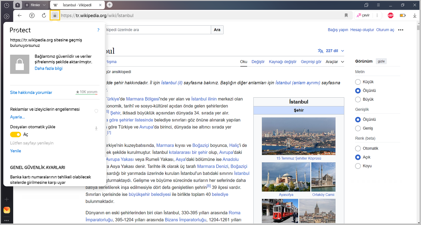 Güvenlik simgeeleri, Akıllı satır'daki sayfa adresinin sağında ve solunda görüntülenir. Protect panelini açmak için simgesine tıklayın. Güvenlik ile ilgili ayrıntıları göreceksiniz; isterseniz bu ayarları değiştirebilirsiniz.
