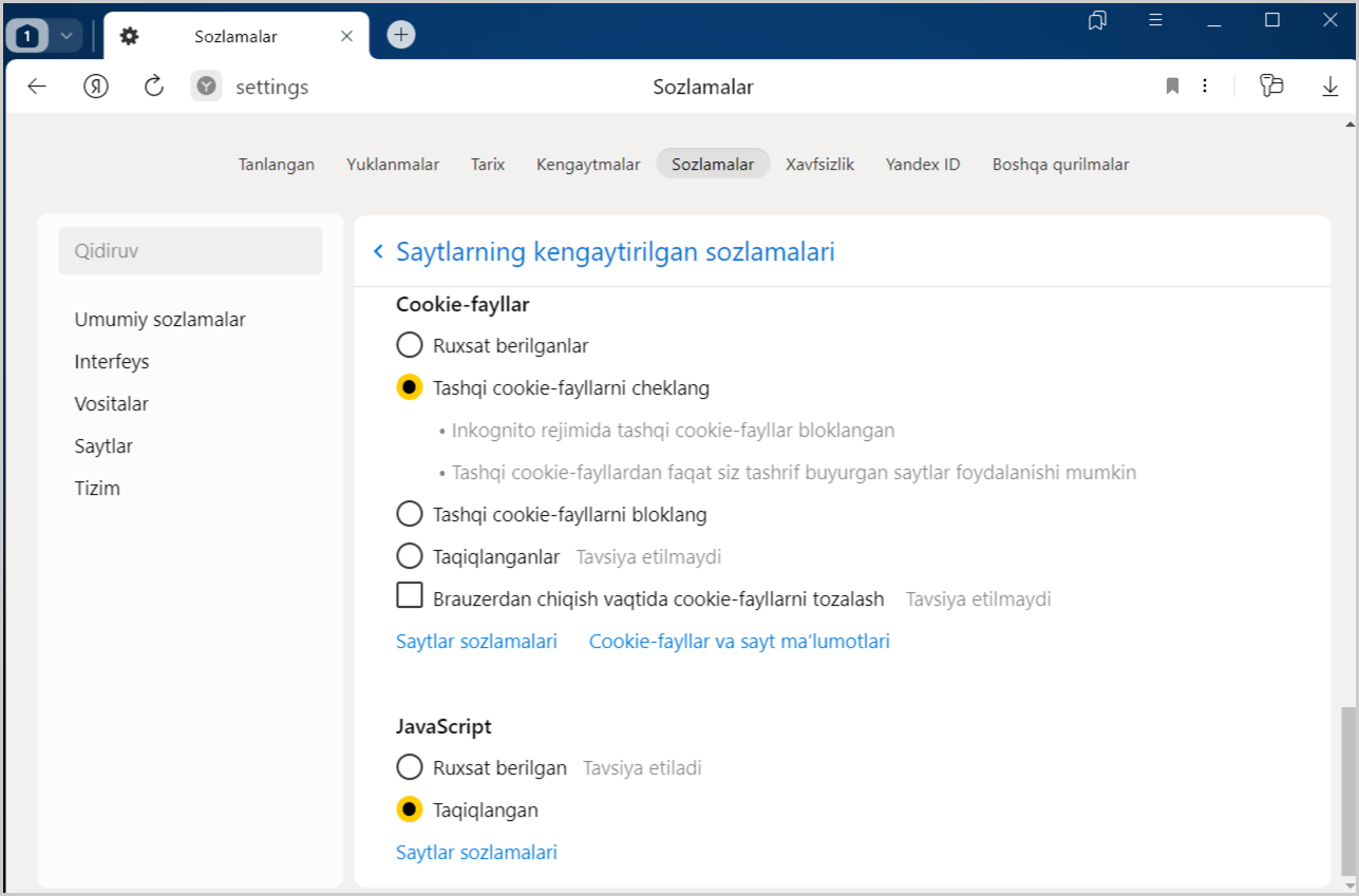 JavaScript bo‘limida Taqiqlangan bandini yoqing.