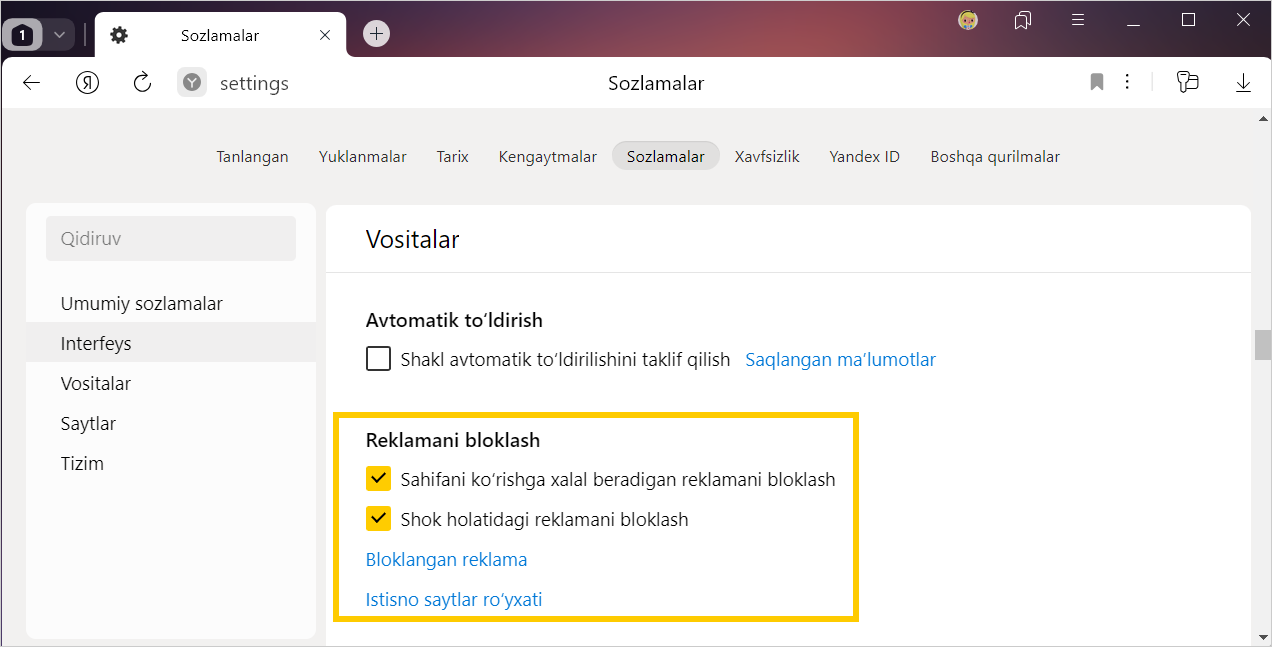 Brauzerni qayta ishga tushiring va kengaytmalar yoqilganini tekshiring. Agar shu yuz bergan yoki reklama faolsizlantirilgan kengaytmalar bilan ham aks etaversa, kompyuterda nomaqbul dasturlar mavjudligini Yandex Rescue Tool vositasi yordamida tekshiring. Nomaqbul dasturiy taʼminotni olib tashlash uchun mazkur vositadan foydalaning.