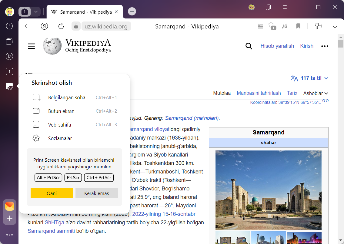 Yandex Brauzerda siz ajratilgan qism yoki butun veb-sahifaning ekran skrinshotlarini yaratishingiz, tasvirni tahrirlash, strelka va yozuvlarni qoʻshishingiz mumkin. Siz skrinshotni doʻstlaringiz yoki texnik yordam xizmatiga yuborishingiz mumkin.